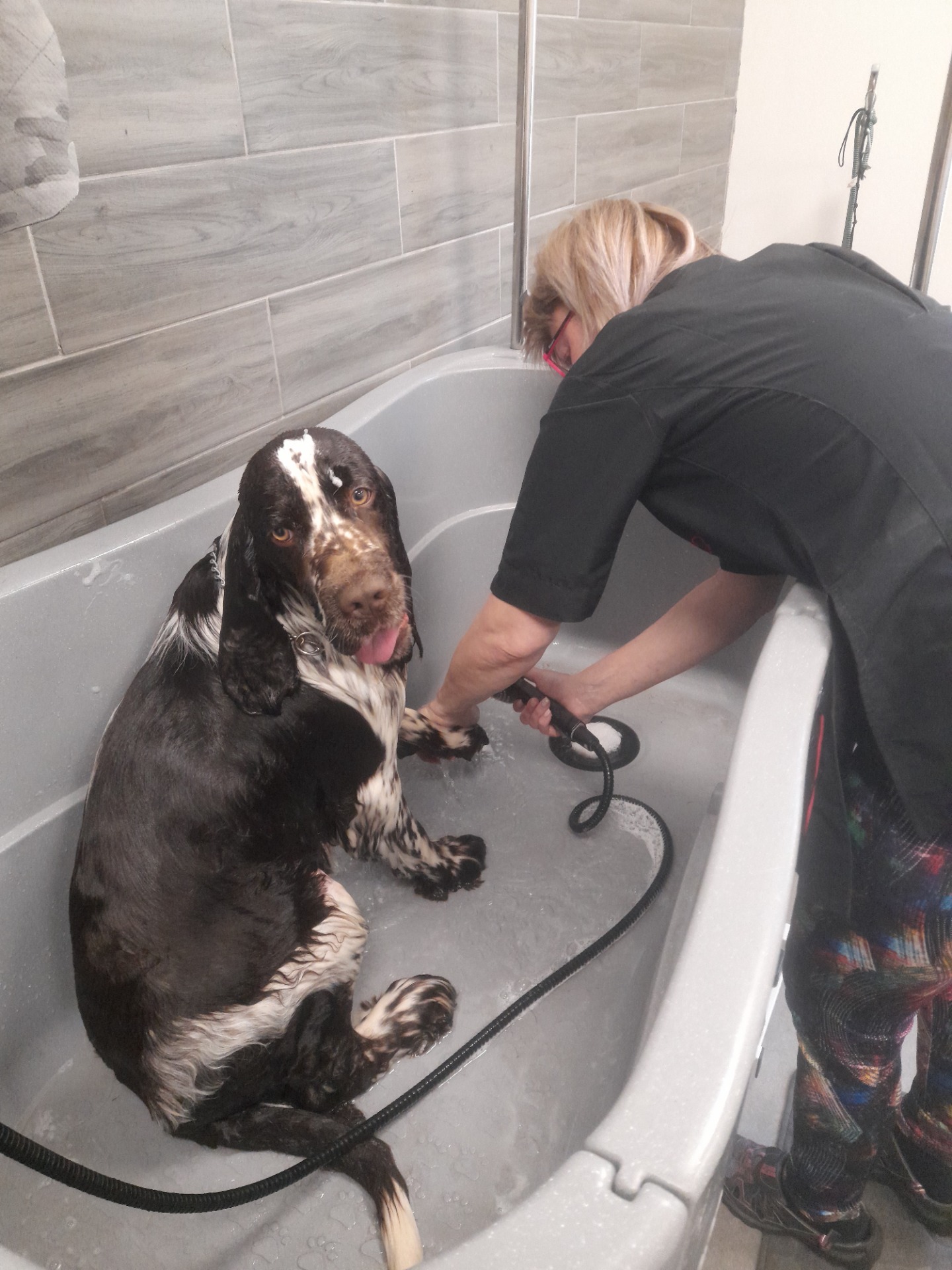 Koupel psů zahrnuje umytí srsti speciálním psím šamponem, který šetrně čistí a zároveň ošetřuje pokožku. Po koupeli se pes důkladně opláchne, aby se zcela odstranily zbytky šamponu.